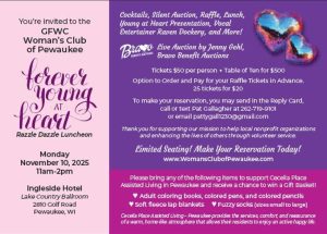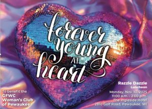 The GFWC Woman’s Club of Pewaukee meets the first Thursday of every month over the lunch hour from September through May (Any exceptions are communicated to members).  Socializing and networking starts at ~11:00 a.m. Meetings begin at 11:30 a.m. with lunch served to follow.  Our programs or presentations from guest speaker begin immediately following, concluding around 2:30 p.m. Guests of members are welcome, but make sure to add them to your reservation